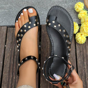 LoopLift Sandals — Lightweight, open-toe slides featuring a shimmering gold-studded hook-and-loop ankle strap and cushioned microfiber lining for breezy, all-day comfort.Perfect for beach days or casual city strolls—stylish, secure, and effortlessly versatile.